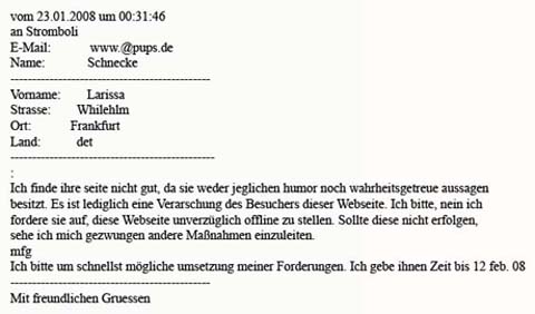 verliehen. Gern hätten wir Dir den Preis unter Deinem richtigen Namen ausgehändigt. Eine Google Recherche mit den spärlichen Hinweisen in Deiner Mail (pups.de , larissa, frankfurt, gastropodia flatulentis) hat uns leider nur zu einer schlecht getarnten Pädophilenseite und zu einer endlosen Liste von Bums- und Massageangeboten geführt. |