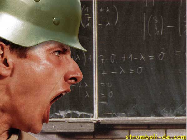 Die Baden-Württembergische Kultusministern Anette Schavan ist genervt. Ihre Forderung: mehr Männer an die Schulen, damit sich die Schüler auch an männlichen Leitbildern orientieren können. STROMBOLI meint sehr gut, Frau Ministerin. Aber bitte nicht noch mehr von diesen Weicheiern, die dort jetzt schon herumlaufen und am liebsten auch ein Kopftuch tragen möchten. Stattdessen erfahrene Ausbilder der Bundeswehr an die Schulen. Dafür kommen die Zicken zum Bund. Nach knüppelharter Grundausbildung ab an die Front. Dort können sie dann lernen, wie man den Taliban die Bärte abschneidet. |