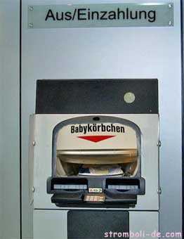 Da die Geschäfte mit Finanzderivaten zur Zeit etwas flau laufen, wollen deutsche Banken jetzt mit einem völlig neuen Selbstbedienungskonzept in den Adoptionsmarkt einsteigen. Dort sind Eigenkapitalrenditen von 25% locker zu erreichen. Erste Geldautomaten wurden schon zu Babyklappen umgerüstet. |
